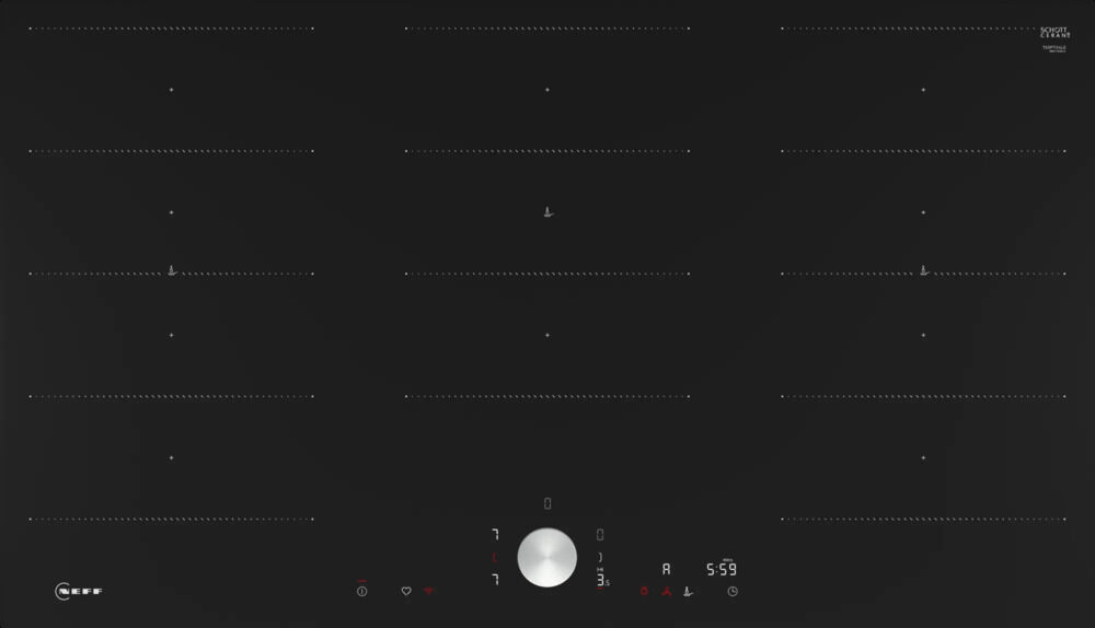 Индукционная варочная панель Neff T69PTX4L0 – 5-конфорочная безрамочная панель с двумя гибкими зонами FlexZone и съёмным контроллером