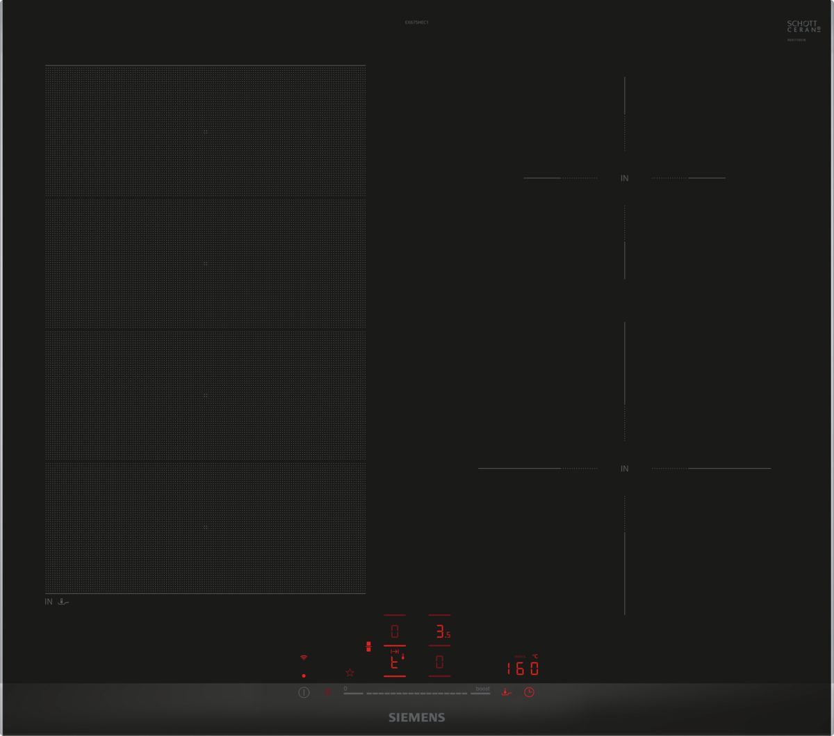 Индукционная варочная панель Siemens EX675HEC1E серии iQ700 сочетает ультрасовременный безрамочный дизайн с революционными технологиями для профессионального результата готовки. Модель выполнена из стеклокерамики Schott Ceran с интегрированной сенсорной панелью управления.