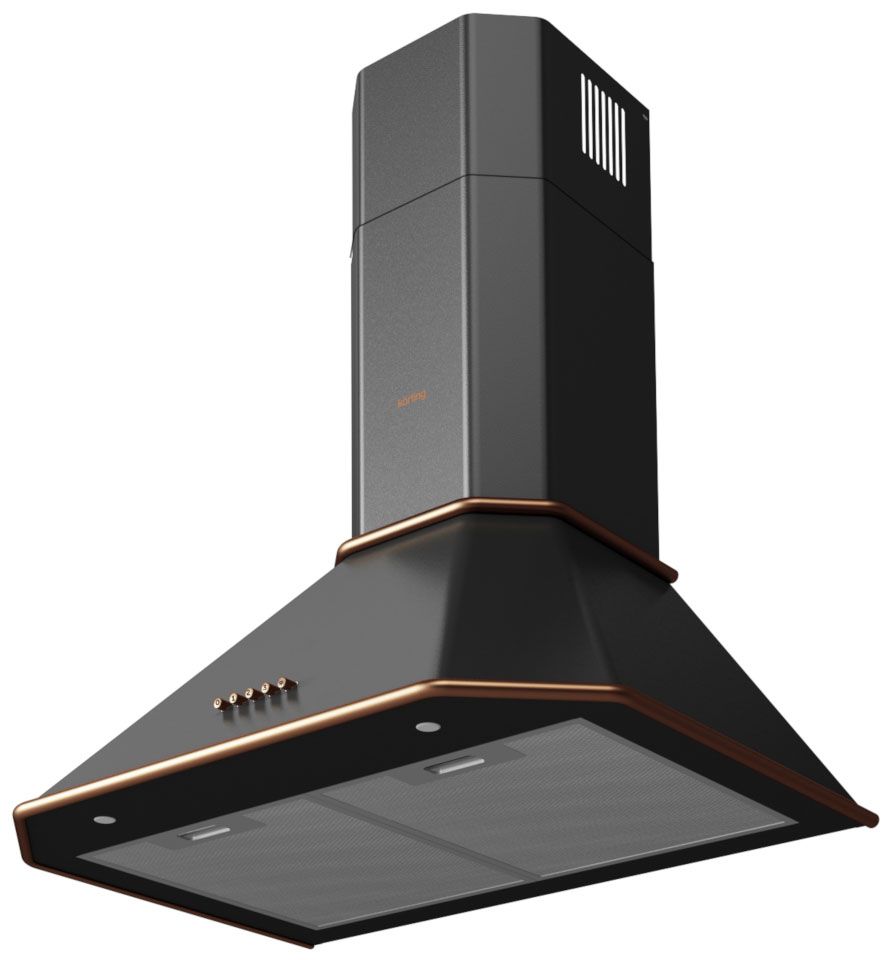 Трендовый индустриальный дизайн – сочетание глубокого матового черного с акцентами под медь создает сдержанный, но очень выразительный образ. Медные детали добавляют теплоту и стильность, что делает вытяжку модным элементом в современных интерьерах.