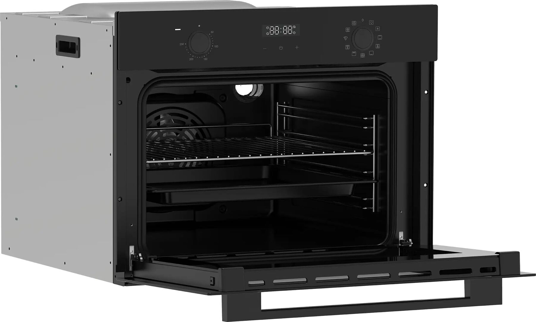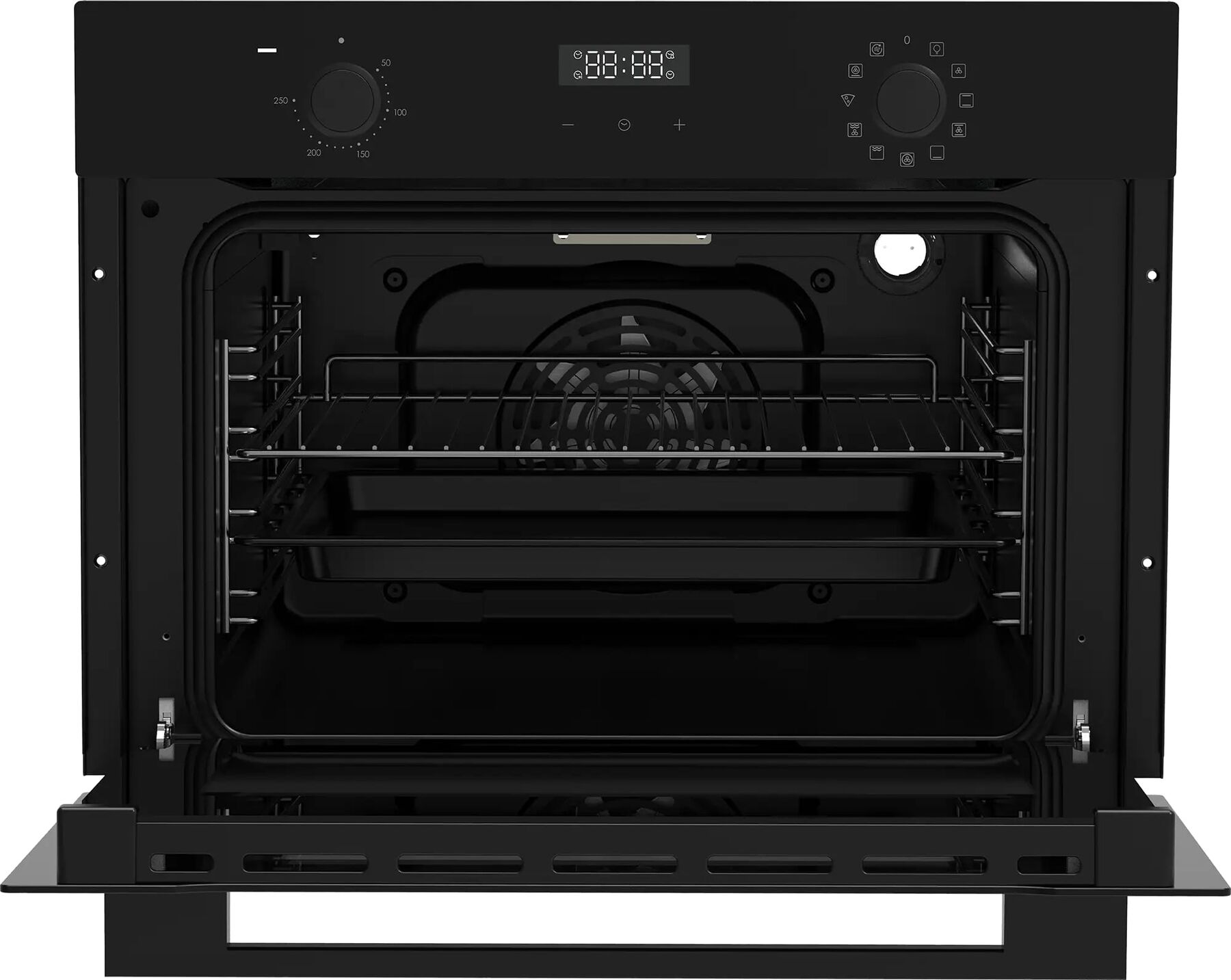 - Компактный размер при вместительности 50 литров – несмотря на уменьшенную высоту (45.5 см), духовой шкаф имеет оптимальный полезный объём 50 литров, достаточный для приготовления большинства блюд для небольшой семьи.