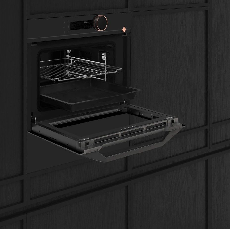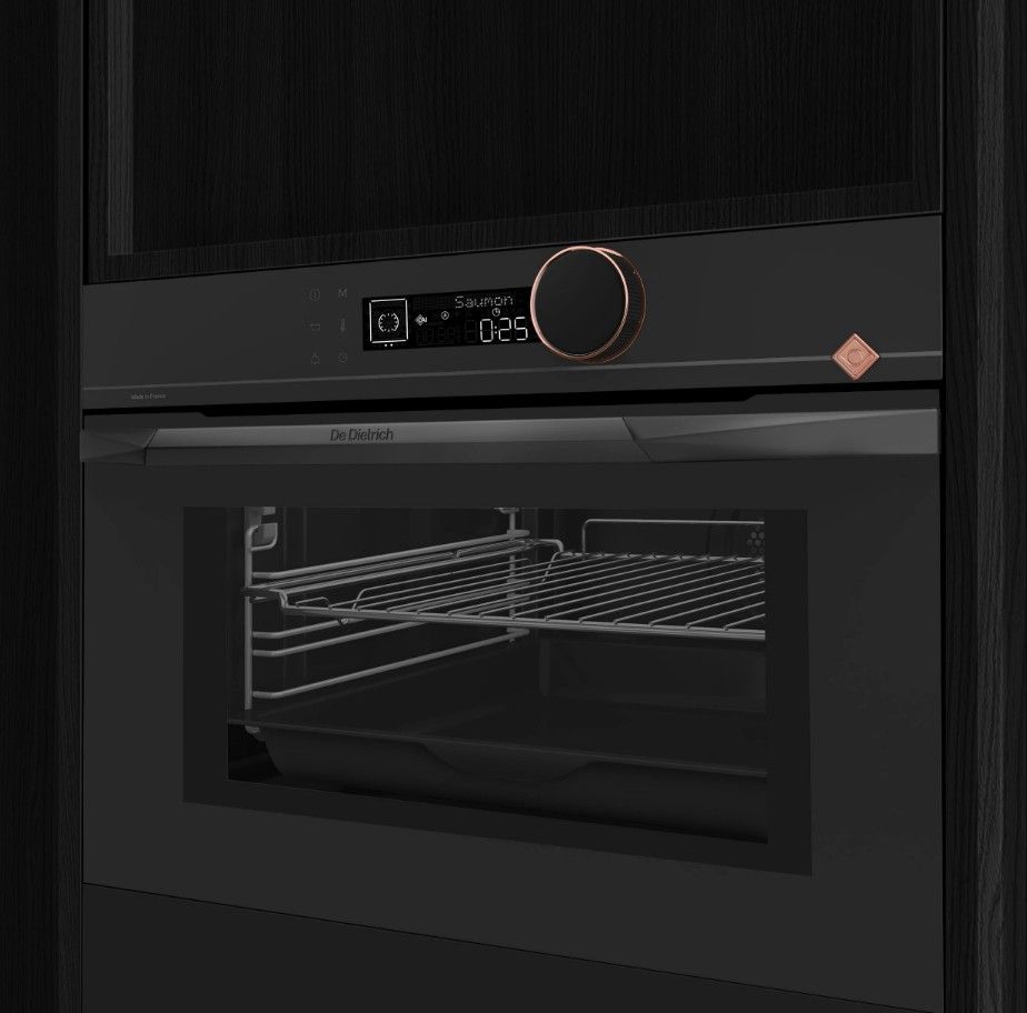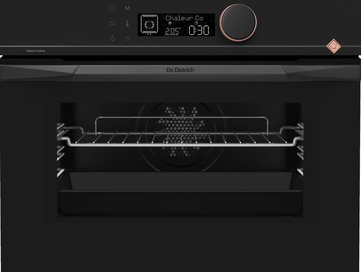 Встраиваемый компактный духовой шкаф De Dietrich DKP4531H в черном цвете — это профессиональная функциональность в формате высоты всего 45 см. Модель из коллекции HERITAGE (Philharmonie) с медной фурнитурой и четырехслойным остеклением дверцы сочетает элегантный дизайн и передовые инженерные решения.