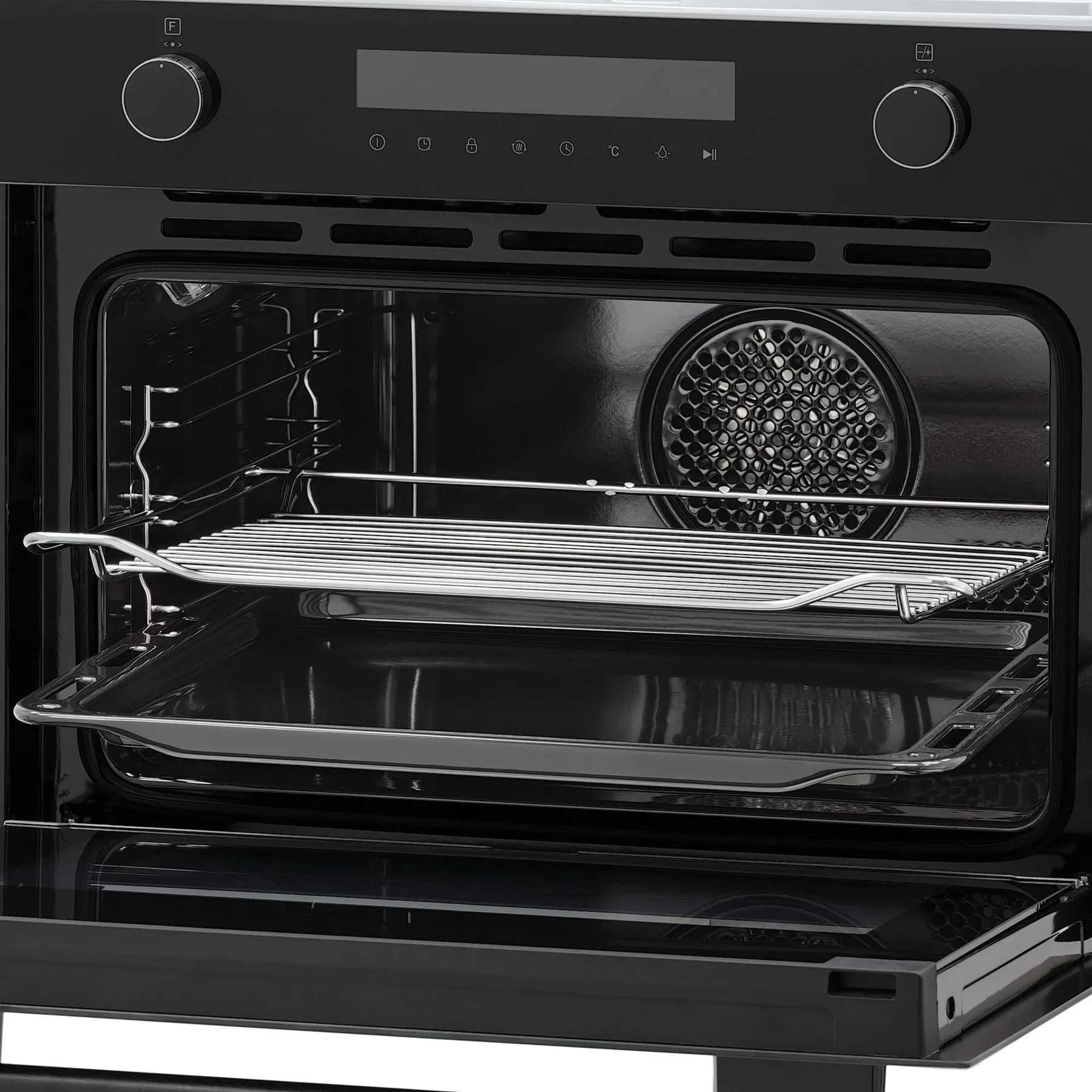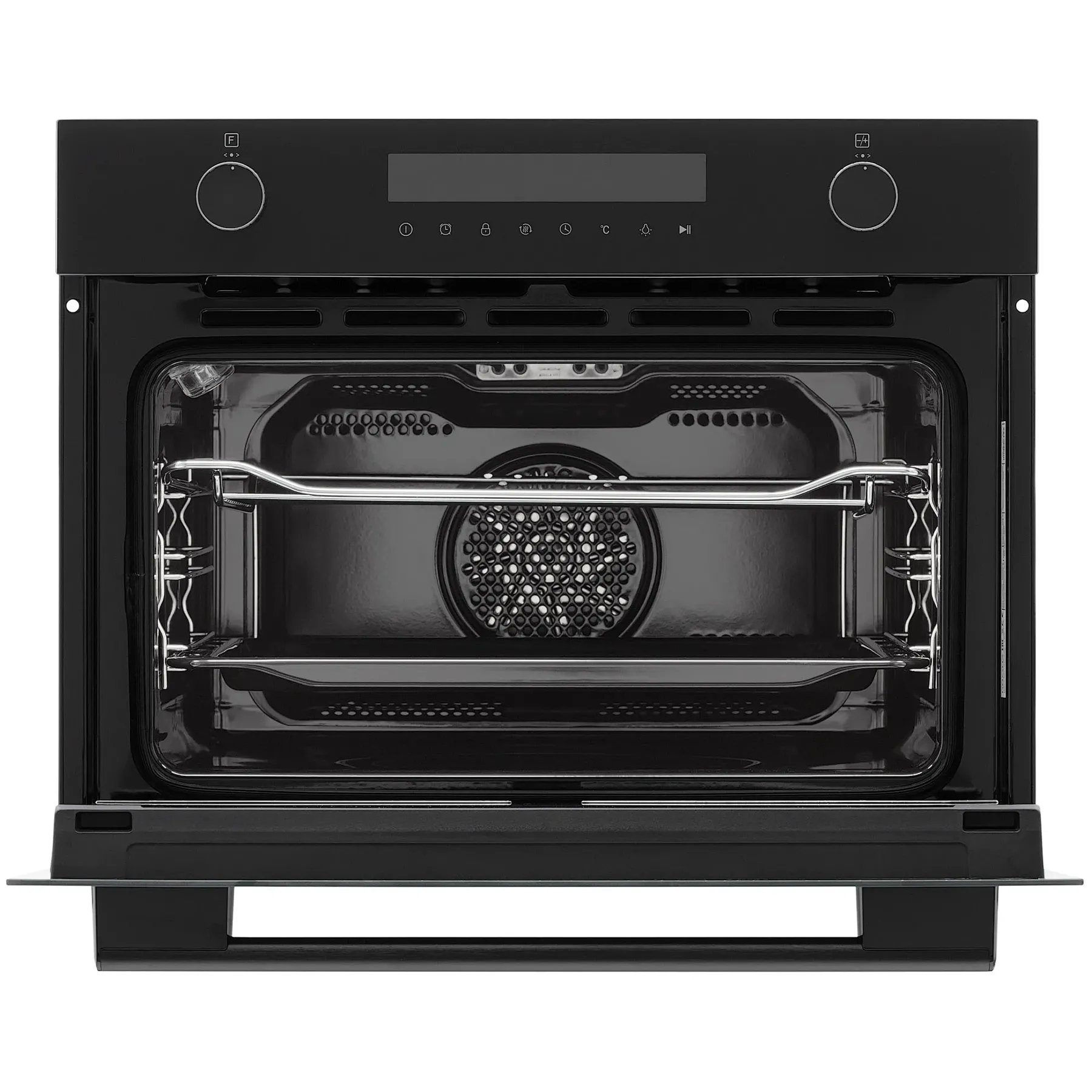 - Компактная высота 45 см при объёме 50 л – идеальное решение для кухонь с ограниченным пространством, позволяющее готовить на 3 уровнях с помощью хромированных направляющих.