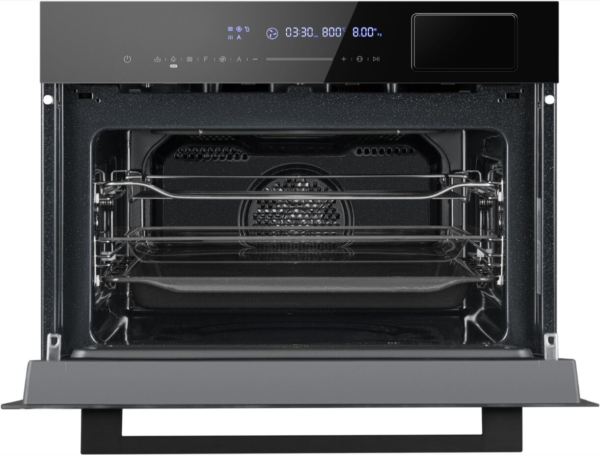 - 3-в-1: СВЧ + пар + духовой шкаф (Black Edition) – объединяет функции микроволновой печи (800 Вт, без поворотного стола), пароварки и электрического духового шкафа с грилем и конвекцией. Дизайн Black Edition с панелью из закалённого стекла придаёт устройству премиальный внешний вид.