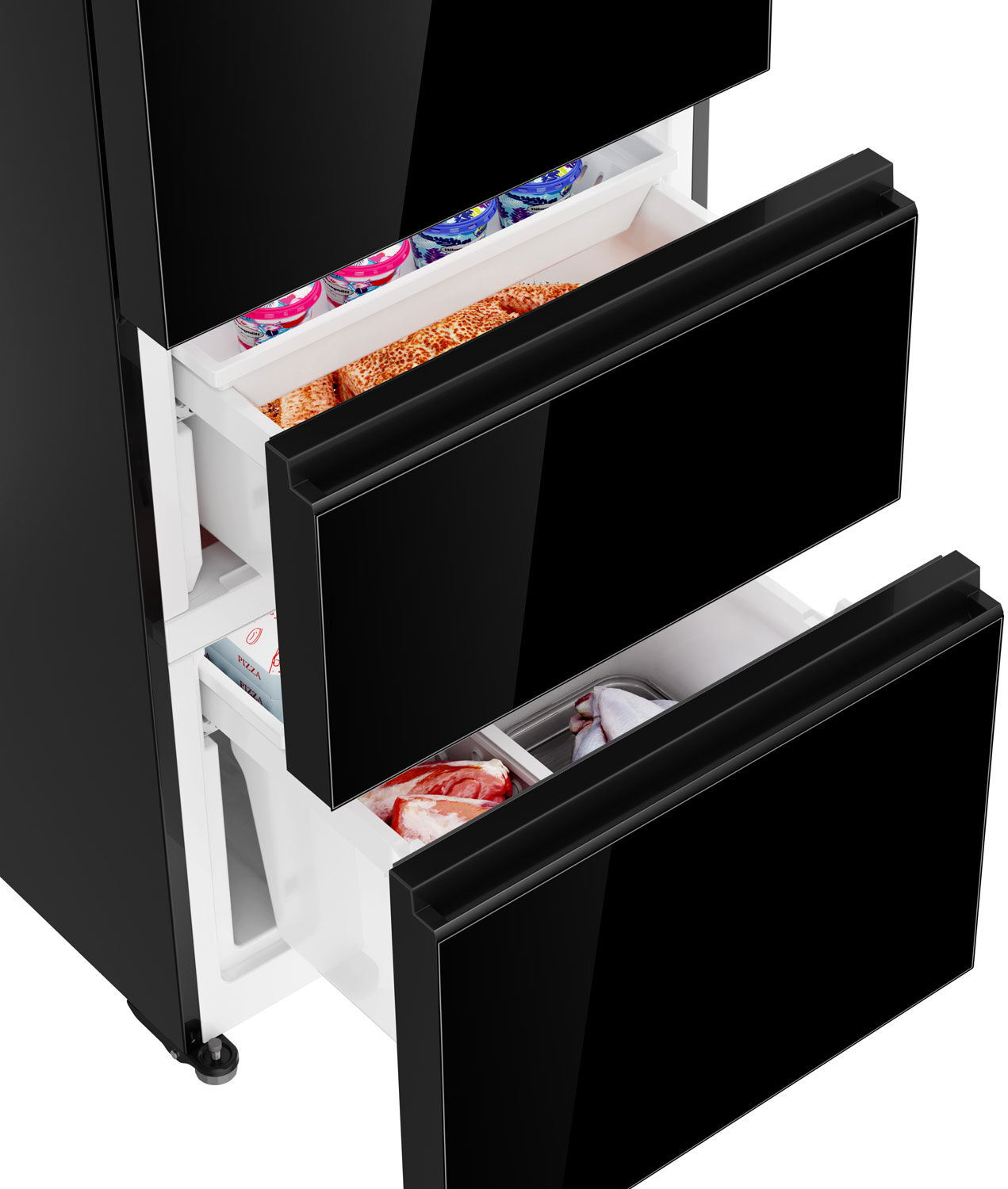 - Премиальный дизайн «чёрное стекло» – корпус с покрытием из чёрного стекла придаёт холодильнику исключительно дорогой и современный вид. Этот материал не только эстетичен, но и практичен: он устойчив к отпечаткам пальцев и легко очищается.