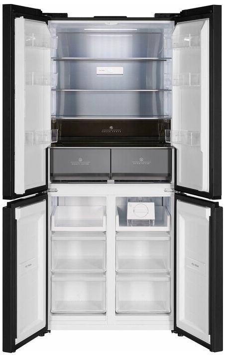 Четырехдверный инверторный холодильник HIBERG i-RFQ 630G B с эффектным черным фасадом из закаленного стекла сочетает лаконичный дизайн и инновации для здорового хранения. Модель с цветным LED-дисплеем может быть как отдельностоящей, так и интегрирована в кухонный гарнитур (глубина 60 см).