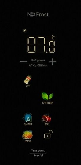 - Режим «Стерилизация воздуха» (ION Fresh) – ионизирует воздух в холодильной камере, уничтожая до 98% бактерий и вирусов (кишечная палочка, золотистый стафилококк). Уровень стерилизации отображается на внутреннем дисплее.