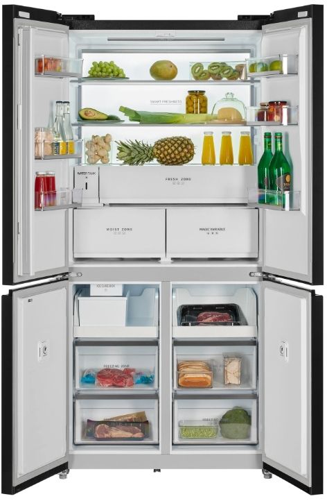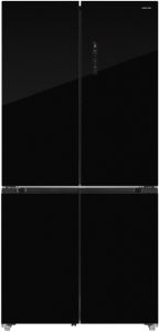 Четырехдверный холодильник HIBERG i-RFQ 705G B с фасадом из черного стекла предлагает безупречную интеграцию в современную кухню. При глубине всего 60 см он сочетает вместительный объем 600 литров, систему Total No Frost и автономный ледогенератор в элегантном дизайне.