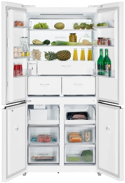 Четырехдверный холодильник HIBERG i-RFQ 705G W с фасадом из белого стекла создан для безупречной встройки в современную кухню. При глубине всего 60 см и высоте 191 см он предлагает вместительный объем 600 литров, систему Total No Frost и автономный ледогенератор.