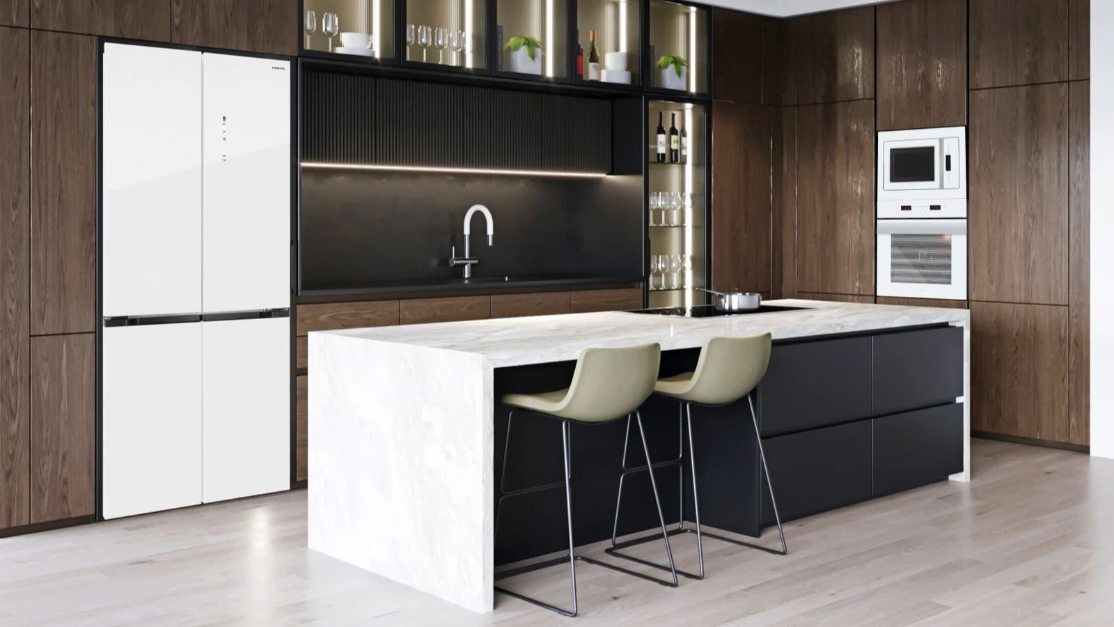 Четырехдверный инверторный холодильник HIBERG RFQ-600DX NFGW в цвете «белое мерцающее стекло» создан для бесшовного встраивания в современную кухню. При глубине всего 60 см модель обеспечивает вместительный объем 526 литров и оснащена передовыми технологиями для сохранения свежести.
