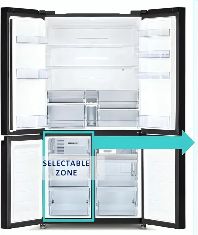 - Дизайн Side by Side – премиальный формат с максимальным удобством – 4 отдельные дверцы в формате Side by Side обеспечивают удобный доступ к продуктам. Раздельное открывание секций экономит холод и электроэнергию.