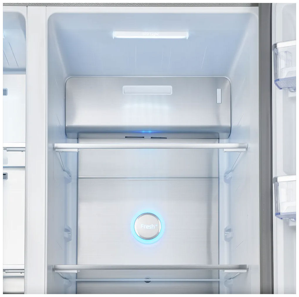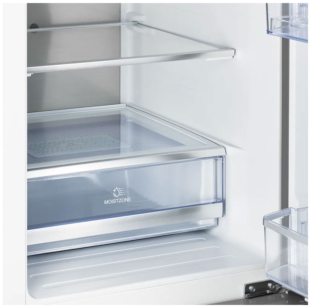 - Холодильная камера: 3 стеклянные полки (2 регулируемые), 3 навесные дверные полки, отсек для овощей, Fresh Zone, светодиодное освещение, антибактериальный пластик