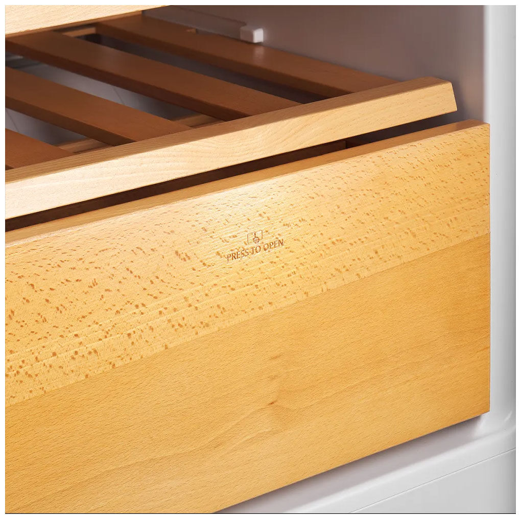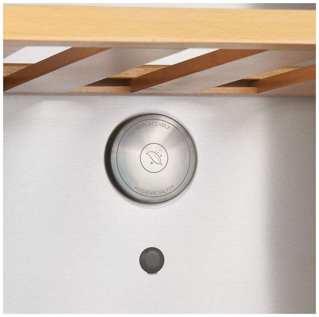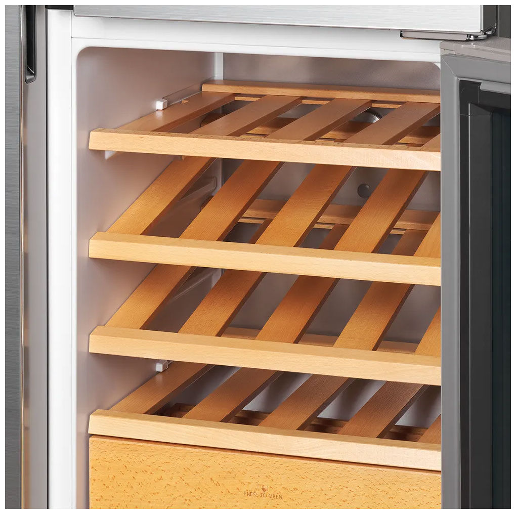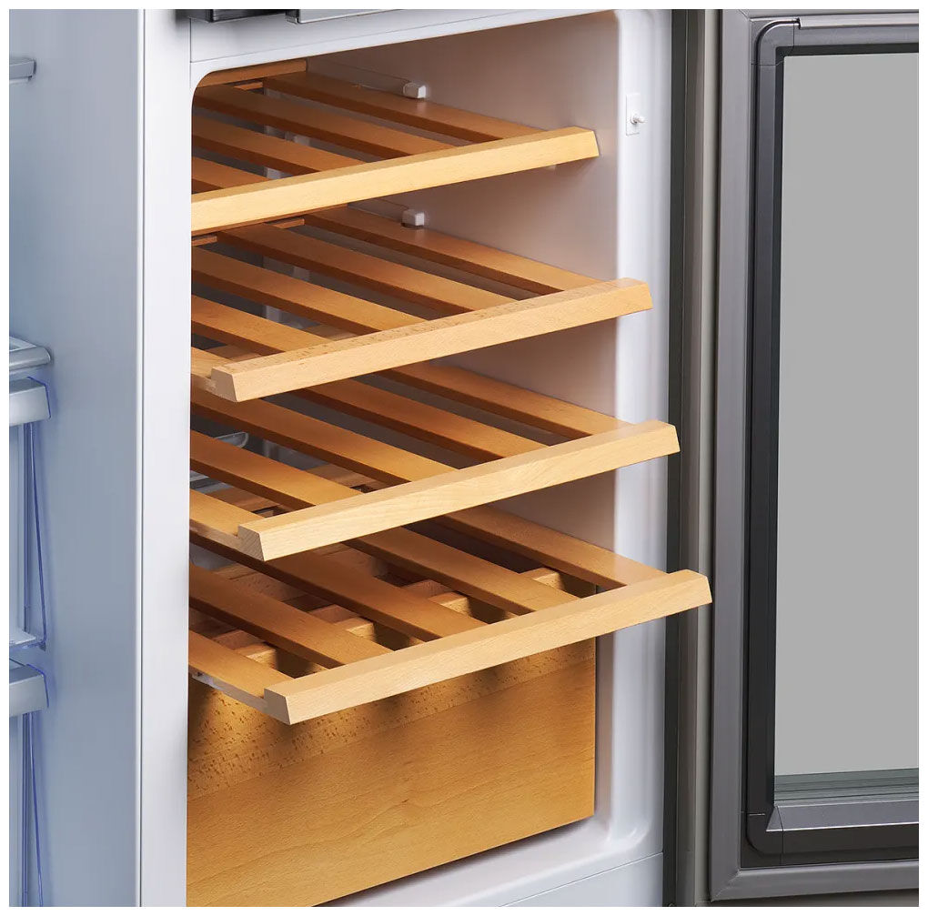 - Винный шкаф на 16 бутылок с деревянными полками из бука – отдельная зона для хранения вина с 4 полками из натурального дерева (бук) и полезным объемом 127 литров создает идеальные условия для вашей коллекции, подчеркивая премиальный статус прибора.