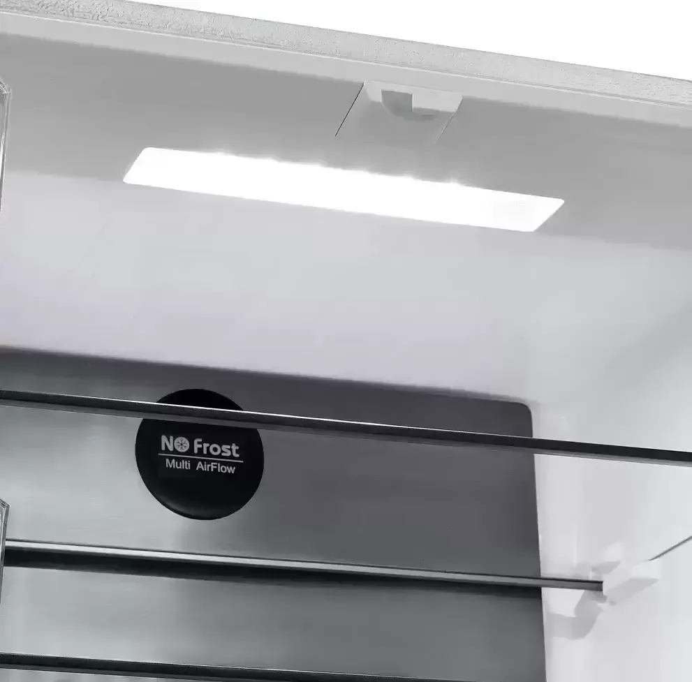 - Система No Frost в обеих камерах – полностью автоматическая система размораживания предотвращает образование инея и наледи, избавляя от необходимости ручного размораживания и поддерживая равномерную циркуляцию холодного воздуха для сохранения свежести продуктов.
