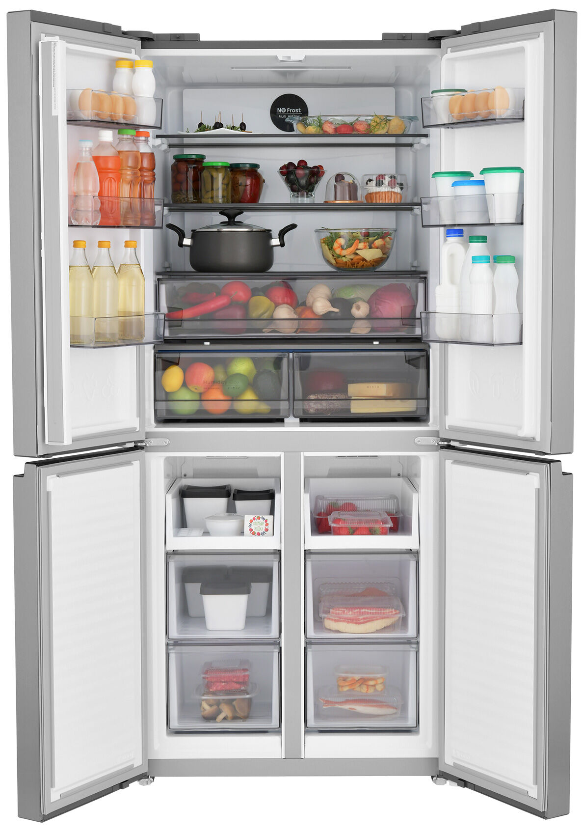 - Дизайн Cross Door с 4 дверцами – премиальный формат и максимальное удобство – 4 отдельные дверцы позволяют открывать отдельные внутренние зоны без дополнительных потерь температуры и электроэнергии. Стильный фасад из брашированной стали выглядит дорого, солидно и не марко.