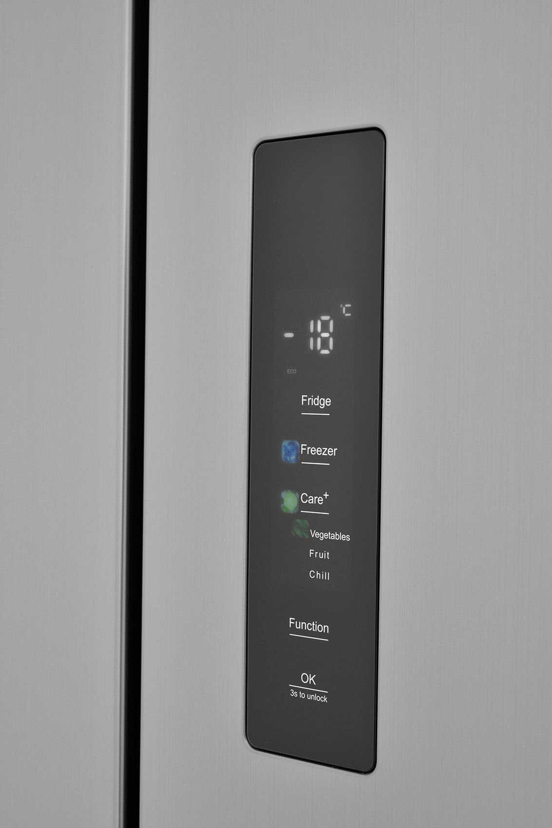 - Зона свежести Care+ с регулируемой температурой – 3 режима для разных продуктов – уникальное отделение с 3 автоматическими режимами: Vegetables/Овощи (7°C), Fruit/Фрукты (4°C) и Chill/Холод (1°C) – для свежего мяса и рыбы. Максимальная гибкость для любых продуктов.