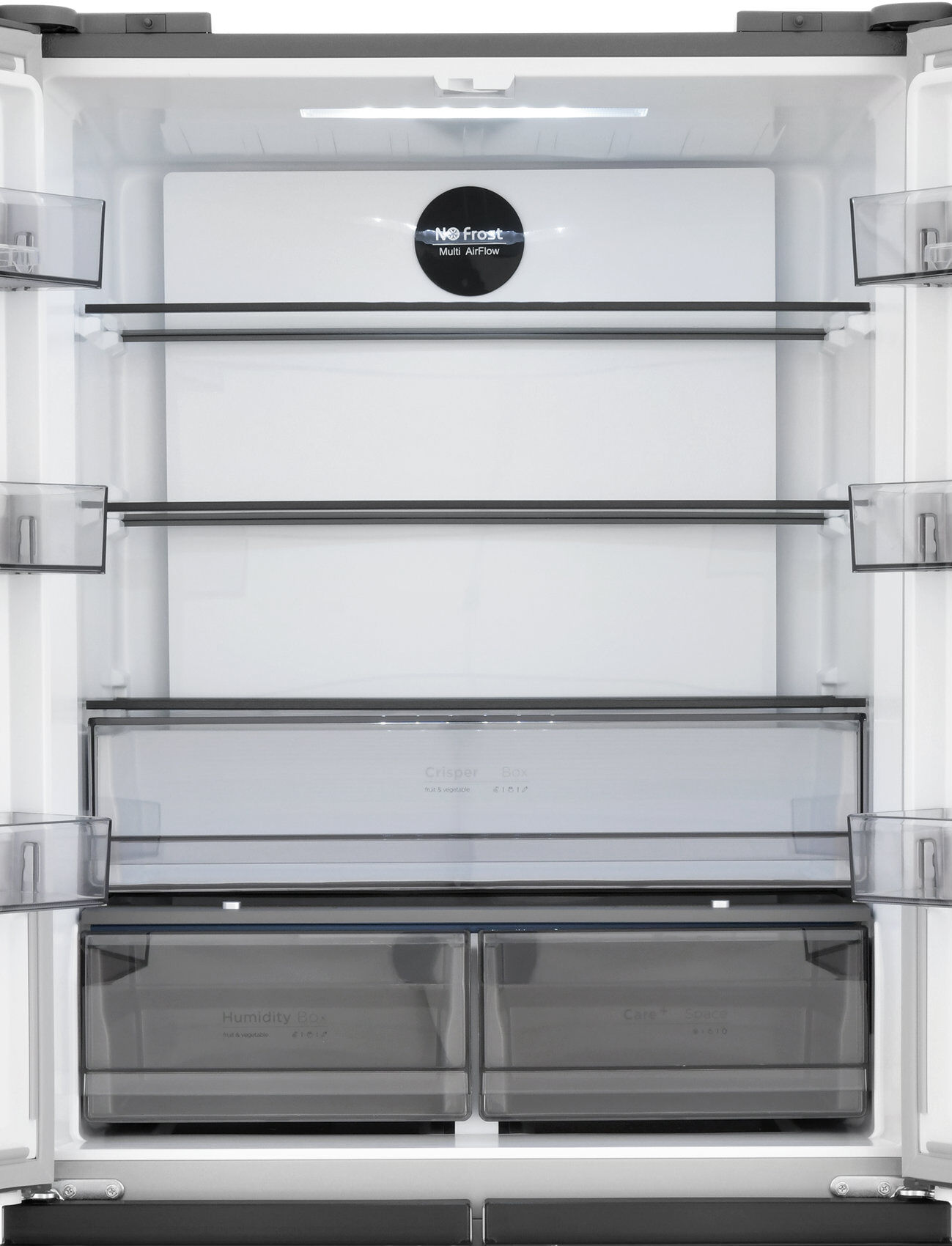 - 6 дверных полок (3+3) – максимальное удобство хранения – 6 полок на дверцах позволяют удобно разместить бутылки, банки, соусы и мелкие упаковки. Всё на виду и под рукой.