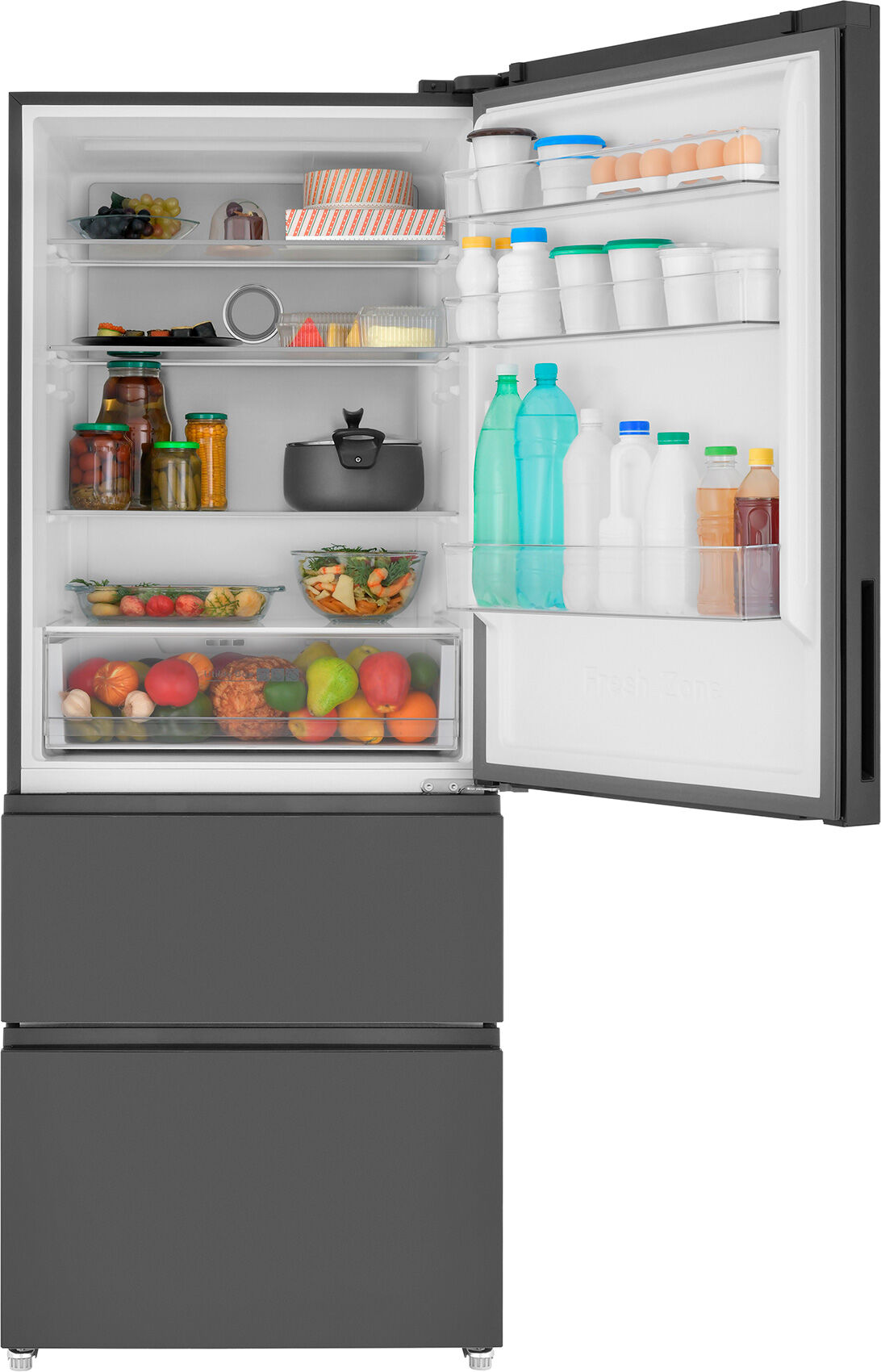 - Italian Door – стильная трёхдверная конструкция в чёрном цвете – верхнее холодильное отделение с одной дверью и нижнее морозильное отделение с двумя выдвижными ящиками. Удобный доступ к продуктам, эффективное сохранение холода и строгий, современный вид, который подходит к любому интерьеру.