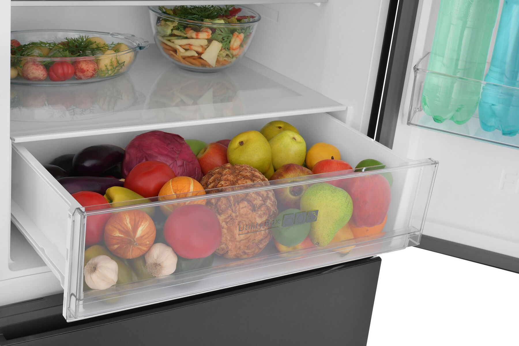 - Внушительный полезный объём 420 литров – для большой семьи и запасов – 275 литров в холодильной камере и 145 литров в морозильной. 4 стеклянные полки, 3 дверных отсека, большой выдвижной ящик для овощей и фруктов и 2 вместительных ящика морозильника – продуманное пространство для любых продуктов.