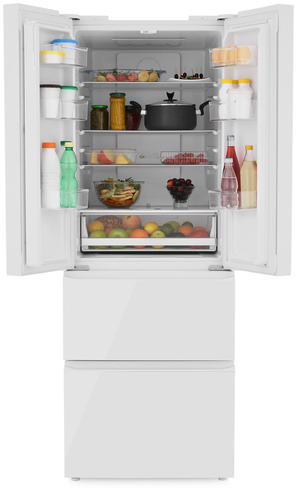 - French Door с 4 дверцами – премиальный дизайн и максимальное удобство – 4 отдельные дверцы и стильное белое стекло. Холодильник, который впечатляет с первого взгляда
