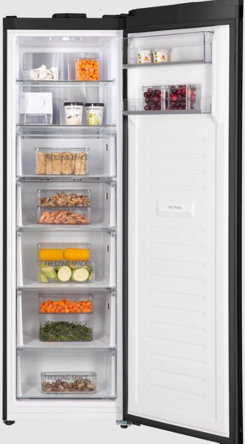 Отдельностоящий морозильный шкаф HIBERG i-FR 44G B предлагает профессиональную мощность заморозки в корпусе с фасадом из глубокого черного закаленного стекла. С полезным объемом 332 литра и системой No Frost он гарантирует долгосрочное и удобное хранение большого запаса продуктов.