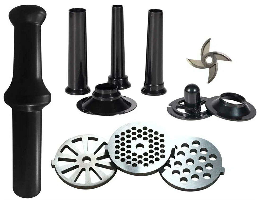 - Комплектация: 3 решетки для фарша, 3 насадки для колбасок, насадка для кеббе, насадка для томатного сока, нож из нержавеющей стали, алюминиевый загрузочный лоток, пластиковый контейнер, толкатель