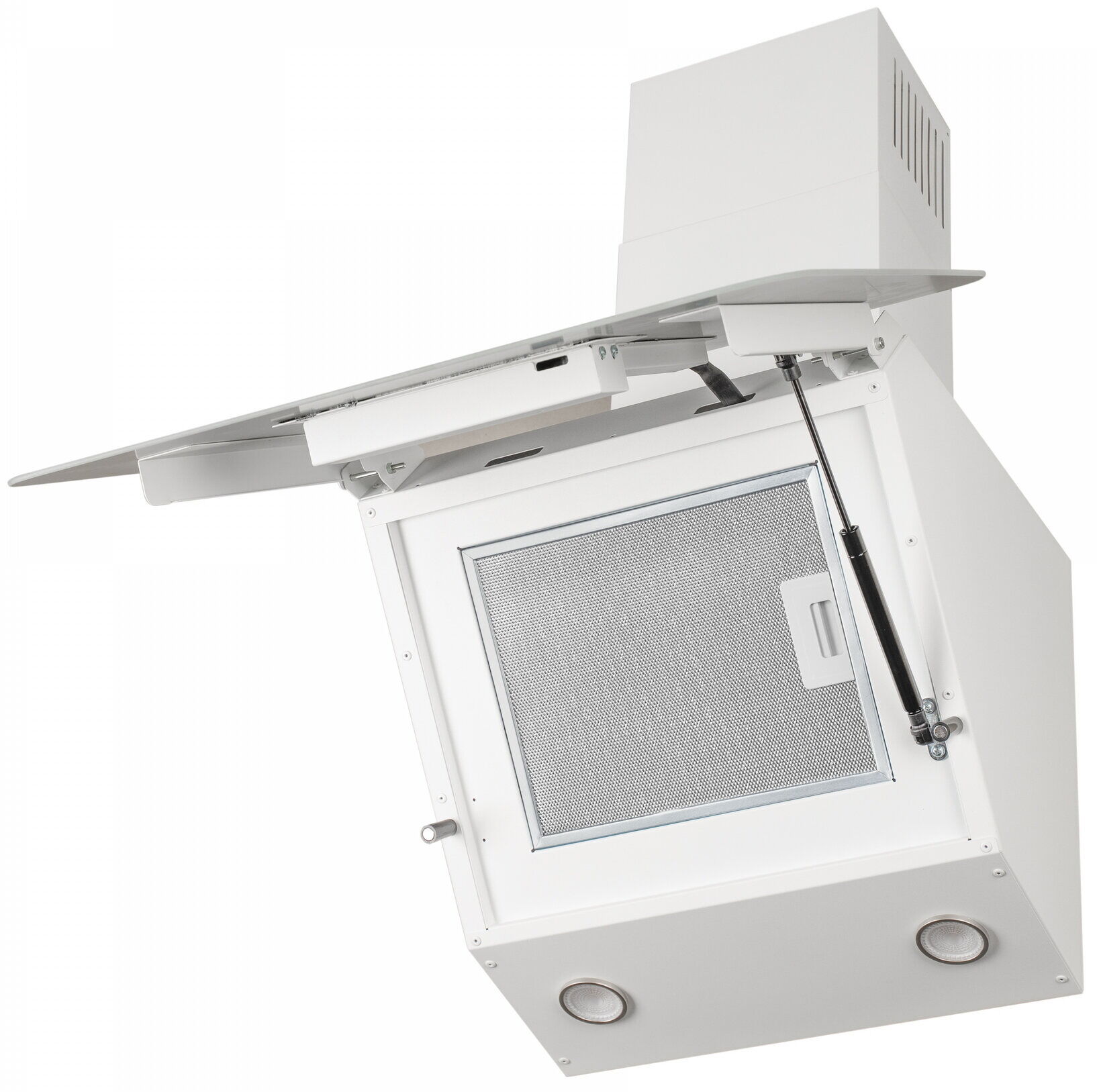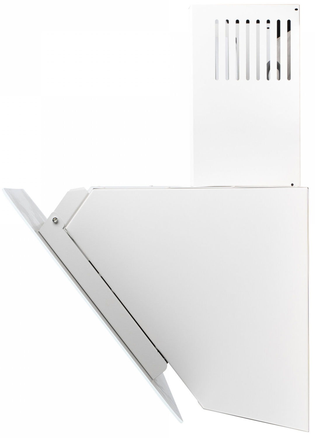 - Стильная геометрия – наклонная форма и белый цвет делают вытяжку акцентным, но гармоничным элементом современной кухни.