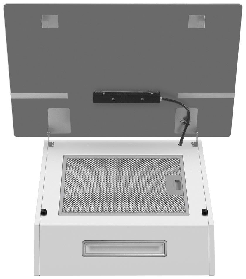 Эргономичный дизайн и светлая эстетика. Наклонная конструкция экономит пространство над плитой, улучшая обзор и доступ. Белое глянцевое стекло визуально расширяет кухню, отражая свет и создавая ощущение чистоты.