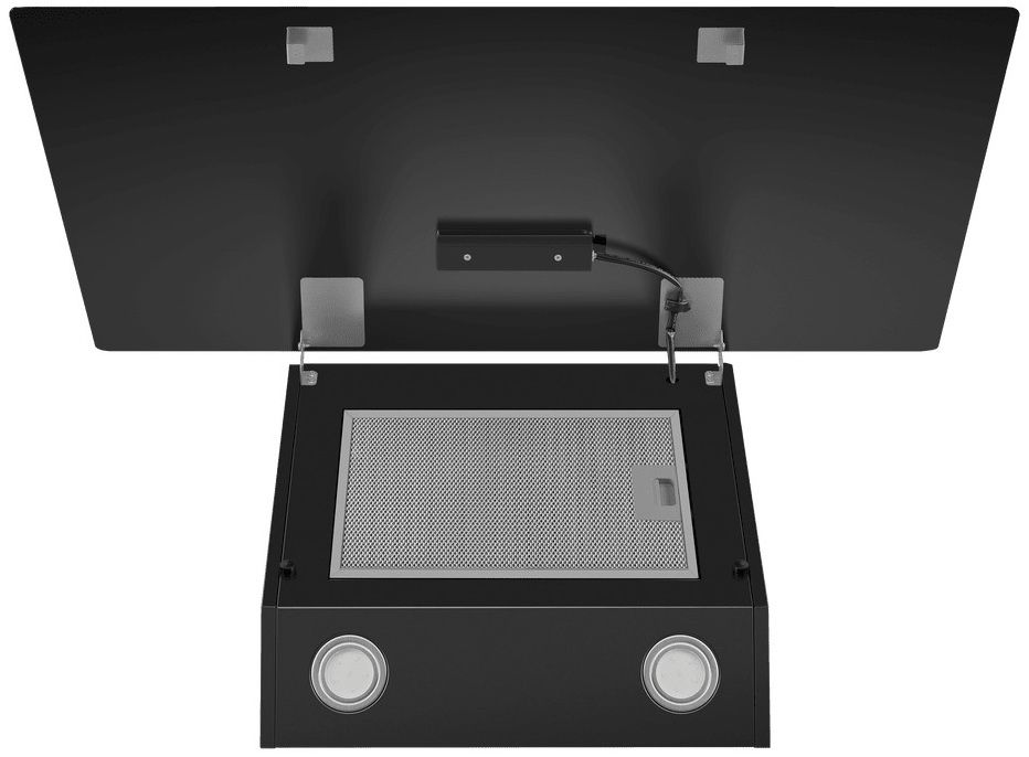 - Стильный наклонный дизайн – фасад из черного стекла и компактная глубина 34.5 см визуально облегчают конструкцию и позволяют эффективно интегрировать вытяжку в современный интерьер.