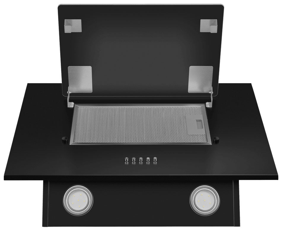 Подъемная стеклянная панель — стильный и практичный элемент. Поднимающееся стекло скрывает алюминиевый фильтр, обеспечивая эстетичный вид в закрытом состоянии и легкий доступ для обслуживания.