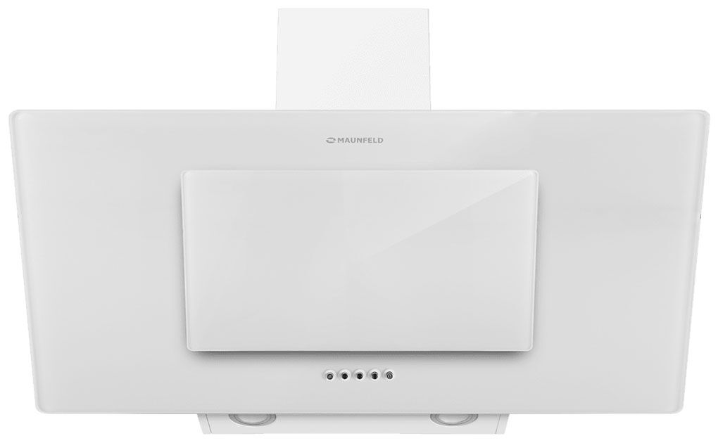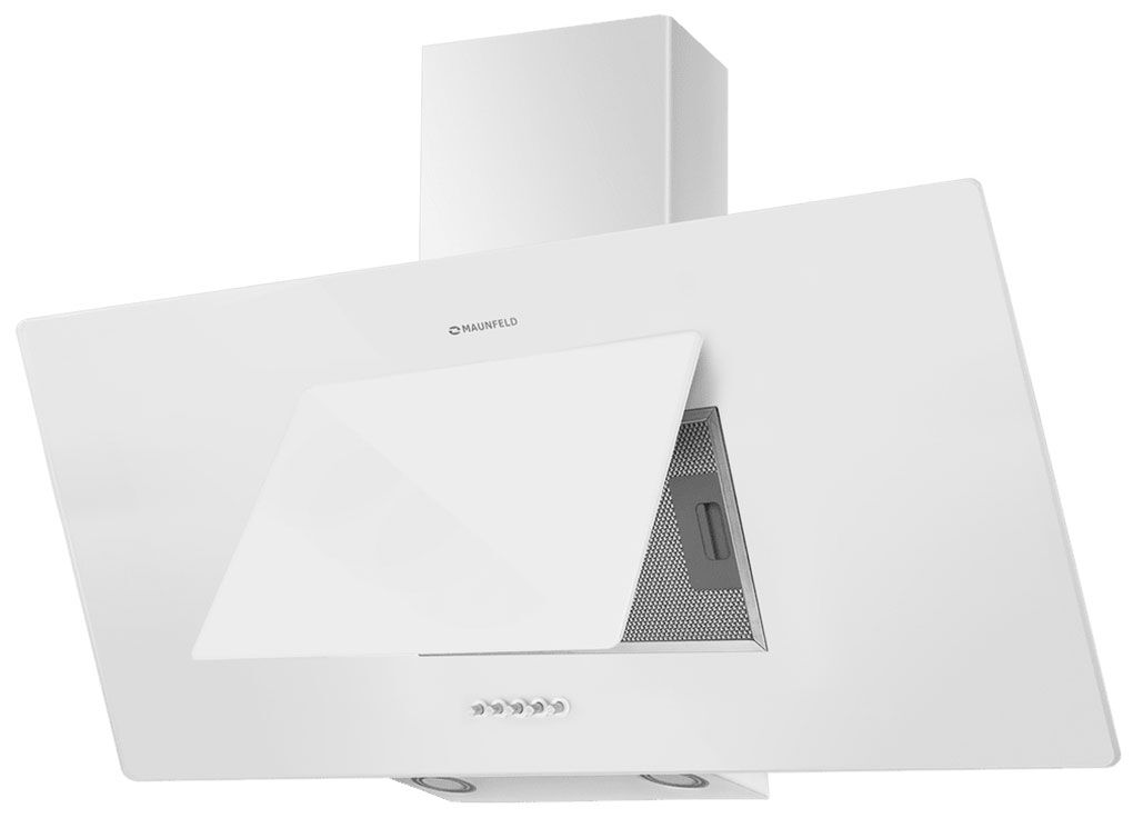 Наклонная вытяжка Maunfeld Tower 90 — широкая белая модель с дизайнерским подъемным стеклом