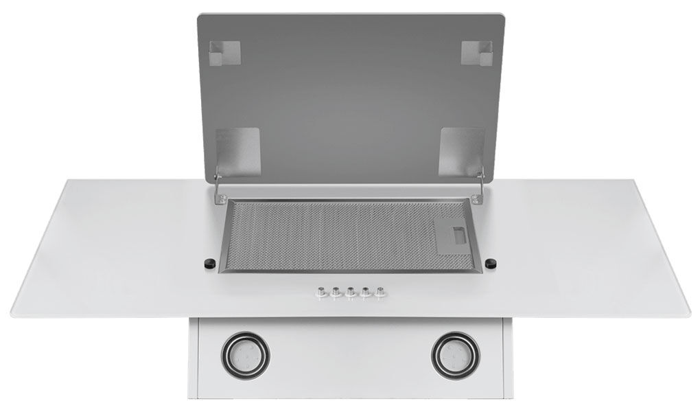 Подъемное глянцевое стекло — дизайнерское решение. Стильное стекло плавно поднимается, открывая доступ к жироулавливающему фильтру, и скрывает его в закрытом состоянии, сохраняя безупречный лаконичный вид.