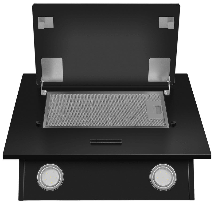 Подъемная стеклянная панель — практичный дизайн. Стекло скрывает жироулавливающий фильтр, обеспечивая эстетичный вид, и легко поднимается для простого доступа при обслуживании.