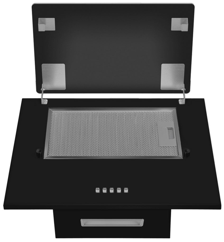Эффектный дизайн и эргономика – наклонная панель из черного закаленного стекла визуально облегчает конструкцию, экономит пространство и повышает эффективность всасывания за счет оптимального угла наклона.