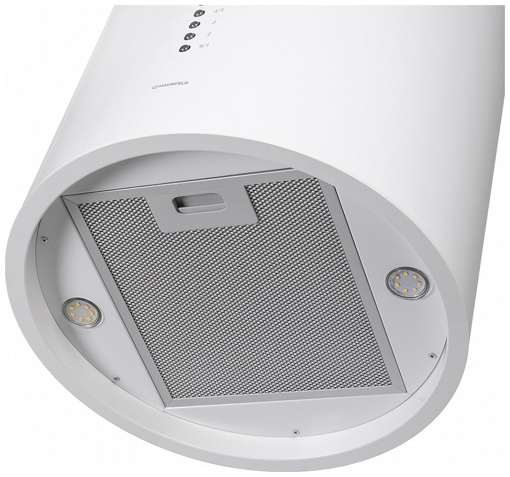 Островная вытяжка Maunfeld Lee Isla 39 в белом цвете – это воплощение современной скульптурной эстетики для кухни с островом. Модель сочетает регулируемую высоту, лаконичный цилиндрический дизайн и производительность 1000 м³/ч, предлагая безупречную функциональность и становясь изящным архитектурным элементом.