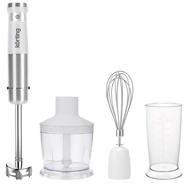 - 3 насадки в комплекте: погружной блендер (нержавеющая сталь), измельчитель (чаша 0.5 л) и венчик для взбивания – полная кулинарная универсальность.