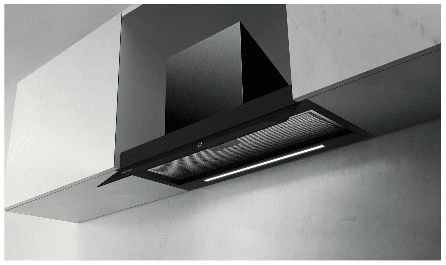 - Стильный откидной стеклянный козырек – элегантный черный козырек с сенсорной панелью управления не только украшает вытяжку, но и защищает верхний мебельный фасад от испарений при встраивании в шкаф.