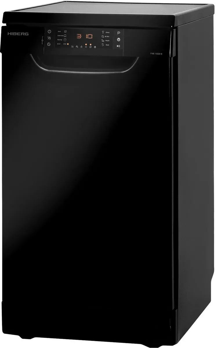 Узкая отдельностоящая посудомоечная машина HIBERG F48 1030 B шириной 45 см — это оптимальный выбор для малогабаритных кухонь. В стильном черном исполнении она предлагает полноценную вместимость 10 комплектов, 8 программ и высокую энергоэффективность (класс A++).