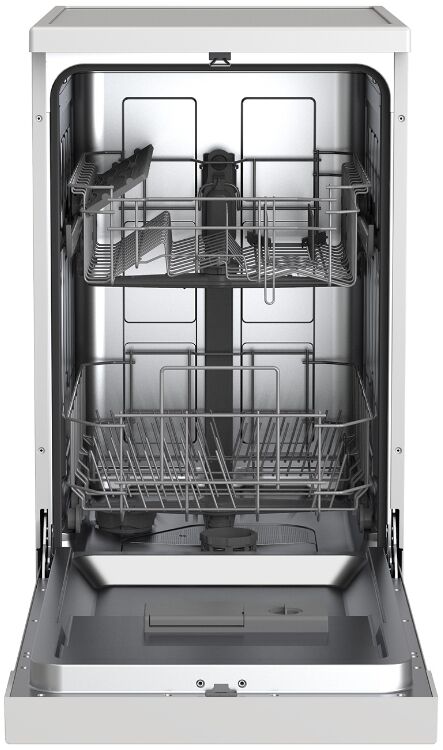 - Компактные размеры при вместимости 9 комплектов – при ширине всего 44.8 см машина легко размещается на небольшой кухне, но при этом вмещает до 9 полноценных комплектов посуды, что идеально для одного-двух человек, дачи или офиса.
