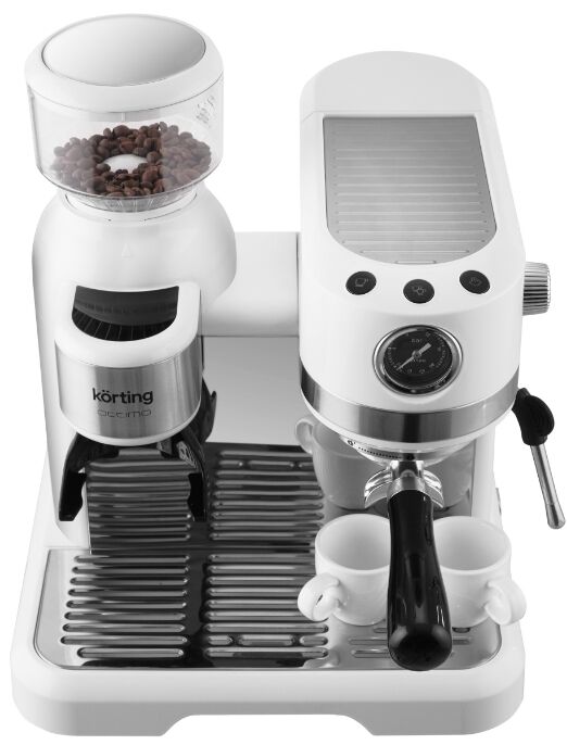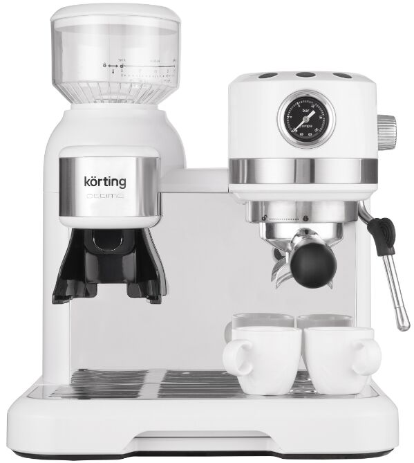 Рожковая кофеварка Korting KCM 1014 SA Ottimo – белая кофейная станция с кофемолкой, манометром и 30 степенями помола