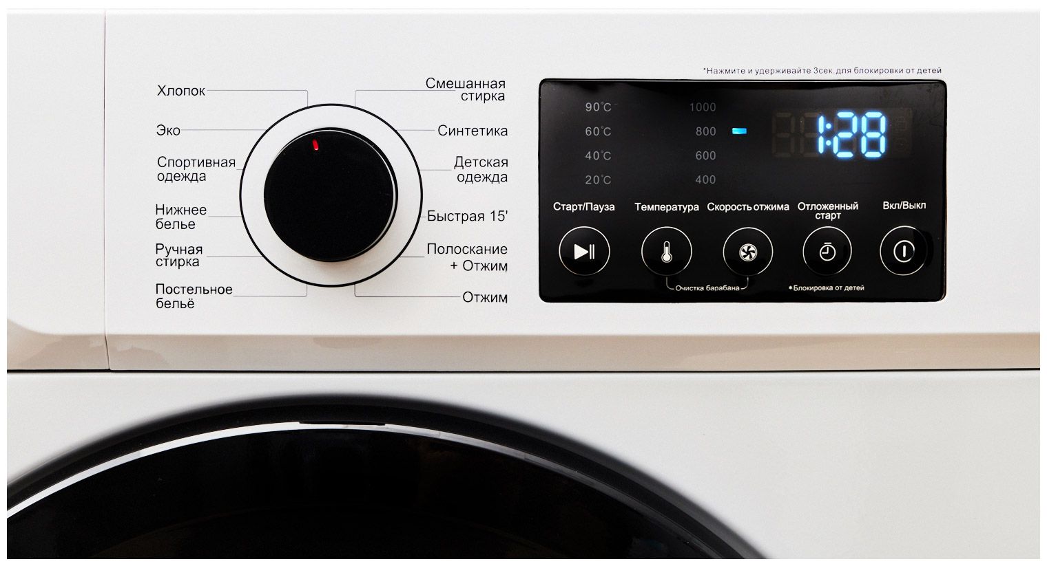 - Яркий LED-дисплей – четкая электронная панель с индикацией оставшегося времени, выбранной программы и статуса работы обеспечивает удобный контроль над процессом стирки.