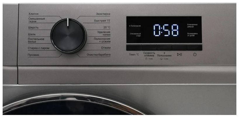 - Уровень шума: 58 дБ (стирка) / 74 дБ (отжим)