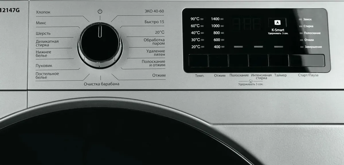 - Интеллектуальная система K-Smart — автоматически определяет вес белья, температуру и время стирки для оптимального расхода ресурсов. Оповещает о перегрузке барабана.