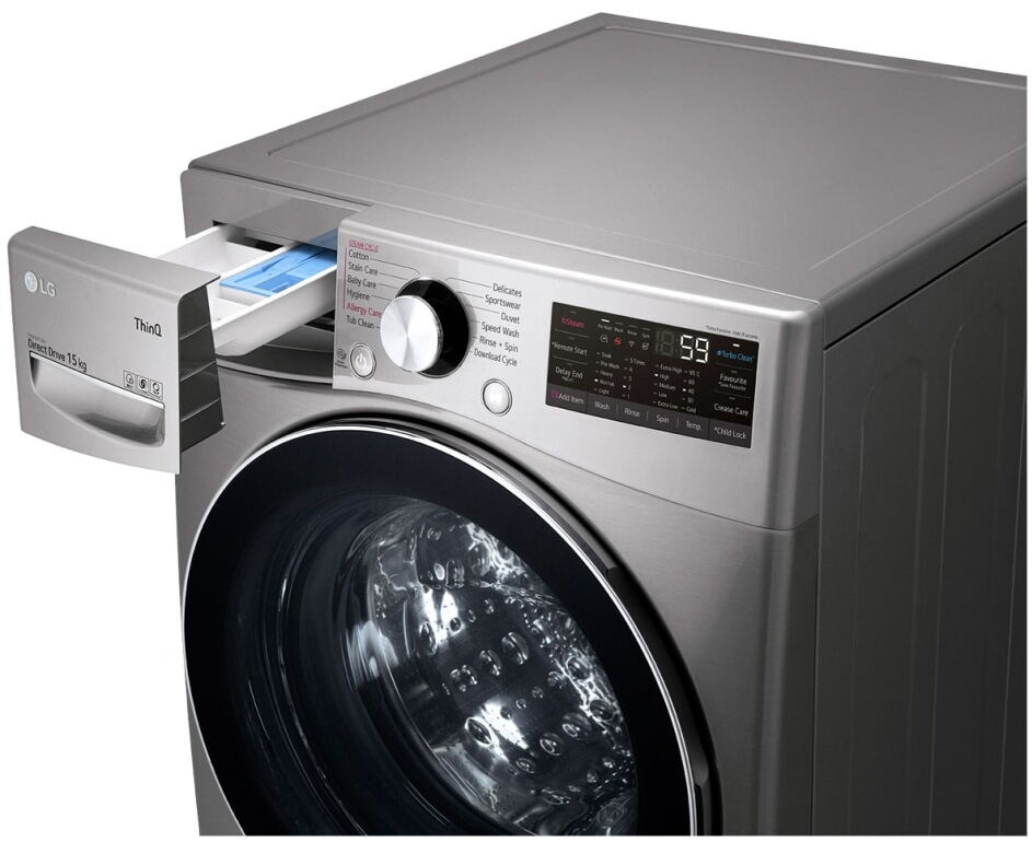 - Загрузка 15 кг и функция TurboWash – стирка больших объёмов быстро и качественно.