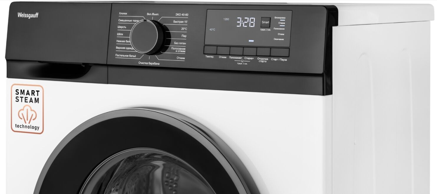 - Функции: стирка с паром, Smart, быстрая стирка 15 мин, Без пятен, дозагрузка