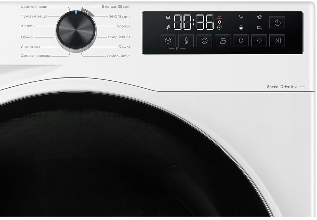 Инверторный мотор – обеспечивает тихую, энергоэффективную и надежную работу с точным контролем скорости вращения барабана.