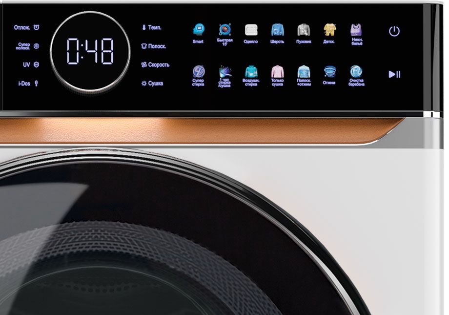 Максимальное удобство – сенсорное управление, LED-дисплей, дозагрузка белья, отсрочка старта и подсветка барабана.