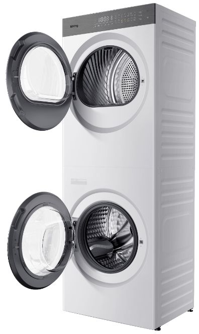 Компактная вертикальная конструкция – экономит площадь в помещении, заменяя два отдельных прибора (стиральную и сушильную машины) одним, требующим только одного подключения.