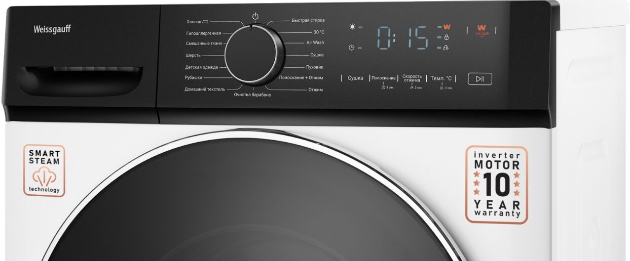 - Инверторный двигатель Technologic Motor BLDC с гарантией 10 лет – двигатель построен по особой технологии, использующей электромагнитное поле для вращения барабана (без применения щёток), что значительно снижает уровень шума (69/76 дБ), износ и энергопотребление. 10 лет гарантии на двигатель – живое подтверждение немецкой уверенности Weissgauff в качестве.