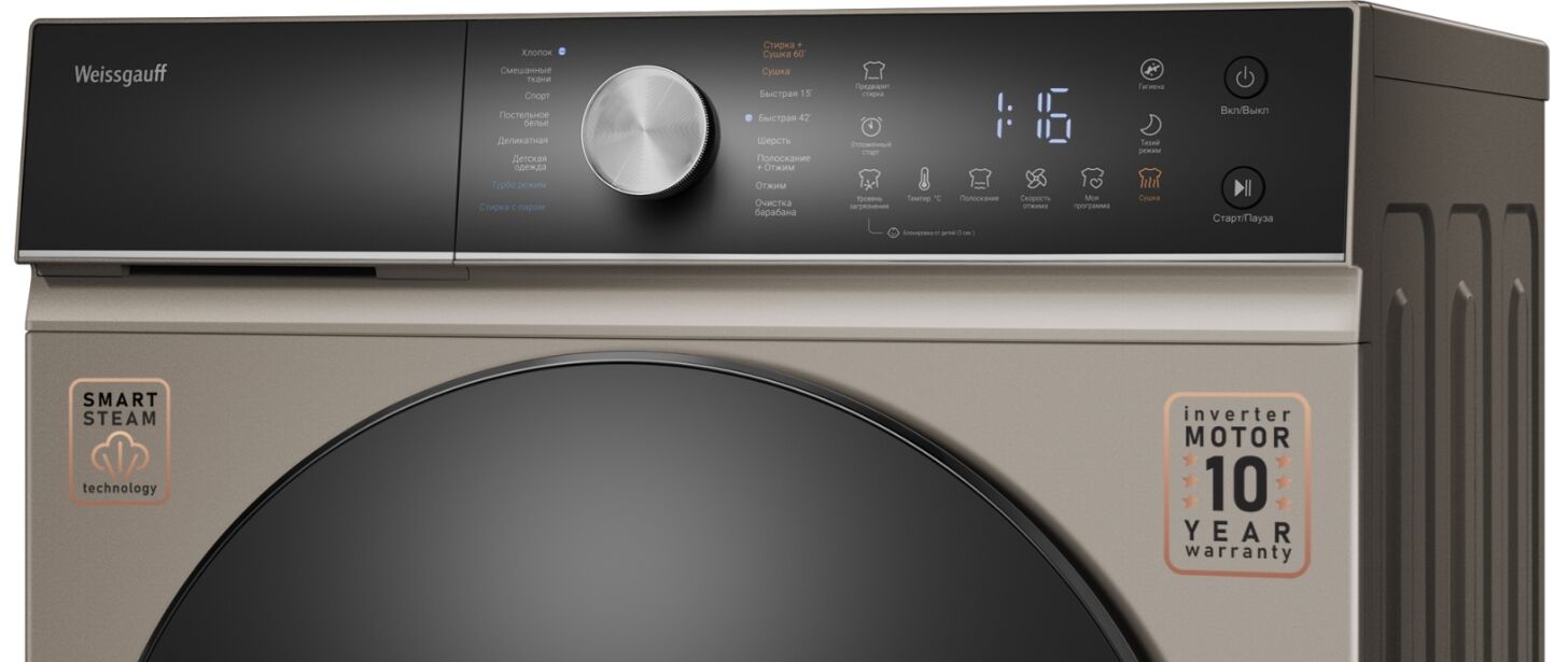 Отдельностоящая стиральная машина Weissgauff WMD 61211 D Inverter Steam Champagne из серии PREMIUM – это одна из наиболее передовых моделей в линейке бренда, объединяющая рекордную вместимость, передовые технологии и роскошный дизайн. Модель с загрузкой 11 кг для стирки и 7 кг для сушки, инверторным двигателем с гарантией 10 лет и функцией пара предлагает непревзойдённую функциональность. 16 программ, включая режим «Стирка+Сушка за 1 час», быструю стирку 15 и 42 минуты, турбо-стирку, детскую одежду, класс A+++ и отжим 1200 об/мин делают эту модель идеальным выбором для большой семьи.