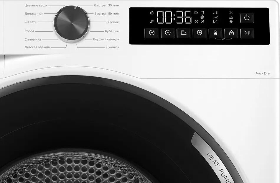 - 12 программ сушки для любых типов тканей – включая «Хлопок», «Синтетика», «Деликатная», «Джинсы», «Верхняя одежда», «Спорт», «Шерсть», «Цветные вещи», «Детская одежда», «Рубашки», «Быстрая 30 мин», «Быстрая 59 мин». Полный набор для бережного и эффективного высушивания.